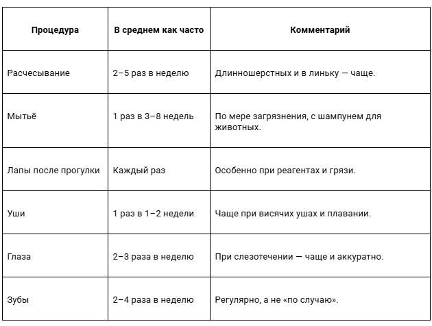 Частота зависит от породы и образа жизни, но полезно иметь простую «шпаргалку», чтобы уход был регулярным и спокойным.